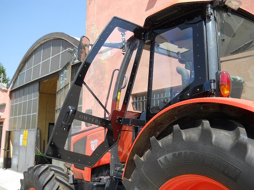 When, however, the solution proposed above is not adequate and the access of the operator is prevented, artisan skill of the mechanical workshop EREA SRL is able to produce solutions "tailored" for each model of tractor. In the two pictures below shows the structural changes realizzed on a door of a cabin made for a Kubota tractor intended to mount steel wheels for paddy field.